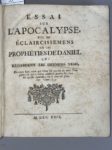 [CRINZOS Théodore]. Essai sur l'Apocalypse avec des éclaircissemens sur des prophéties de Daniel qui regardent les derniers tems. Sans lieu, 1729 ; in-4 demi-vélin ancien, fente à un mors.