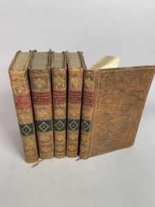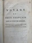 [FORTIA DE PILES Comte Alphonse de]. Voyage de deux français en Allemagne, Danemark, Suède, Russie et Pologne fait en 1790-1792. Paris, Desenne, 1796 ; 5 volumes in-8, veau raciné de l'époque, chaînette dorée sur les plats, dos lisses ornés de motifs dorés, pièces rouges et bleues.