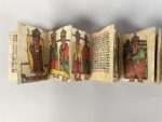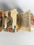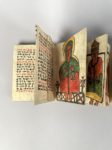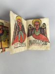 MANUSCRIT À PEINTURES ÉTHIOPIEN. Période indéterminée ; leporello en 24 volets de peau animale, repliés en accordéon, traité d'un seul côté, formant un volume in-16 (117 x 90 mm), à chaque extrémité plaque de bois clair formant protection, rehaussée de taches brunes.