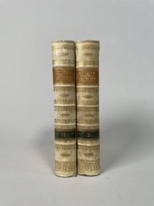 SCHOELL Frédéric. Histoire abrégée des traités de paix. Manuscrit daté de Rome, 1823, 1824 ; 2 volumes in-8 de 332 et 428 pages d'une écriture serrée mais lisible, et nombreux feuillets blancs, reliures italiennes de l'époque vélin ivoire, dos à nerfs ornés de motifs dorés, pièces bleues et orange.