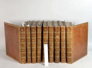SHAKESPEARE William. The dramatic works revised by George Steevens. Londres, J. and J. Boydell, G. and W. Nicol, 1802 ; 9 volumes in-folio, reliures anciennes cuir de Russie brun, dentelle dorée sur les plats, dos à 6 doubles-nerfs, dentelle intérieure et tranches dorées, petite fente à quelques mors, 3 coiffes un peu râpées, deux plats détachés
