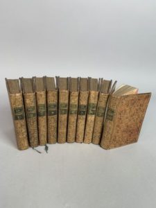 VOLTAIRE. Théâtre ; augmenté de deux pièces qui ne se trouvent pas dans les éditions précédentes. Londres (Paris ?), 1782 ; 10 volumes in-32, veau porphyre de l'époque, filets dorés sur les plats, dos lisses ornés de motifs dorés, pièces noires, dentelle intérieure et tranches dorées.