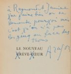 LE NOUVEAU CRÈVE-COEUR. Paris, Gallimard, 1948 ; demi-veau bleu nuit. Envoi « à Raymond et Janine [Queneau] que j'aime bien on se demande pourquoi mais c'est qu'on n'a pas les yeux en face des trous ». Aragon a supprimé les deux c de crève-coeur.