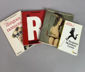 BENAYOUN Robert. Dossier le concernant provenant de Jean-Claude Carrière, contenu dans une chemise au nom de « Le journal du jour de votre naissance ». Extraits d'ouvrages où apparaît souvent André Breton, dessins originaux ou reproduits, découpes, photographies, autographes, essais de mise en page de l'un de ses livres, plusieurs exemplaires de Tir de barrage et de Coup de semonce, etc.