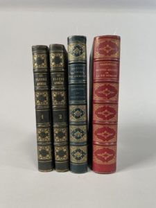 PETITES MISÈRES DE LA VIE HUMAINE. Texte par Old Nick. Paris, Garnier frères, [1846] ; fort volume très grand in-8, demi-chagrin rouge, dos à nerfs orné de motifs dorés. Très nombreuses figures de Grandville gravées sur le bois tirées dans le texte et hors-texte. Fraîche et jolie reliure de l'époque.