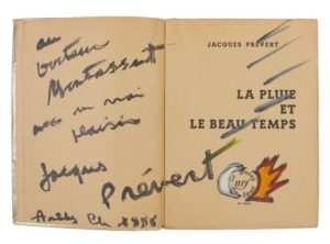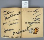 PRÉVERT Jacques. La pluie et le beau temps. Paris, NRF, 1955 ; in-8 carré broché. GRAND ENVOI …