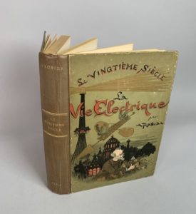 ROBIDA Albert. Le Vingtième siècle. La vie électrique. Texte et dessins par A. Robida. Paris, Librairie illustrée, (1883) ; fort volume in-4, cartonnage de l'éditeur illustré de fers spéciaux en couleurs avec dos de toile brune.