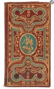 Exemplaire dans une reliure ornée d'une rare plaque comprenant des listels formant des compartiments bordés de points, de traits, de roulettes et de motifs de volutes et de feuillage dorés. Au centre se trouve un fer représentant un chien accompagné d'attributs de chasse.
