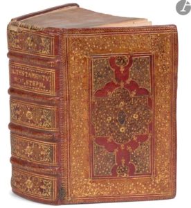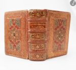 Paris : Robert Ier Estienne, 1549. — 2 parties en un volume in-16, 16, maroquin rouge, plats ornés d'un décor aux petits fers, comprenant au centre un compartiment rectangulaire aux bords lobés, orné de volutes filigranées et de points dorés entourant un losange central, ce compartiment étant inscrit dans un rectangle centrale de trois filets dorés aux coins compartimentés ornés de volutes dorées filigranées et de points dorés, motif doré dans le même esprit entre les deux compartiments en haut et en bas, le tout inscrit dans un large cadre composé de volutes filigranées dorées, et d'une roulette dorée à l'extérieur, dos à nerfs orné, tranches dorées sur marbrures (reliure du XVIIe siècle).