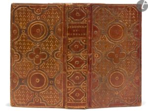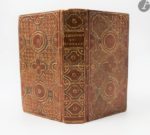 Exemplaire dans une étonnante reliure sur les plats et le dos de laquelle a été dessiné et peint un décor à compartiments type fanfare. Ce décor a été réalisé par un amateur à une époque postérieure à la reliure, peut-être au XIXe ou au XXe siècle. La qualité de cette dernière et la finesse de la roulette dorée sur les chasses, nous paraissent en effet en décalage avec le décor qui couvre les plats et le dos, qui semble d'une réalisation peu académique.