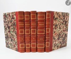 Édition in-18 des chansons de Béranger formée des 3 volumes des chansons publiés en 1829, du tome 4 paru à Bruxelles la même année, comprenant notamment les chansons érotiques, de l'édition en partie originale de 1833 des « Chansons nouvelles et dernières » et du recueil de partitions gravées des chansons de l'auteur.