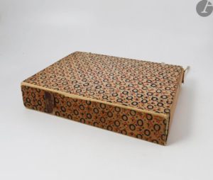 Déchirures à la couverture et aux rabats de la chemise. Mouillure à un angle des premières planches.