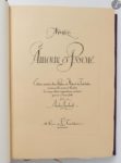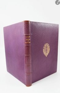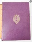 Paris : à la Tradition, 1939. — In-4, maroquin violet, blason doré au centre du premier plat, dos à nefs, maroquin violet en encadrement à l'intérieur, orné de listels de maroquin havane et vert foncé, d'une roulette dorée et de fleurs dorées aux angles, doublures et gardes de soie moirée mauve, tête dorée, non rogné, couverture et dos conservés, chemise à dos et bandes à rabats de maroquin violet, étui (Van West-Beloeil).