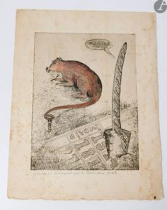 EXEMPLAIRE COMPRENANT JUSTEMENT L'UNE DE CES DEUX SEULES ÉPREUVES D'ESSAI DE CETTE GRAVURE, offerte à M. Brun par l'auteur en 1996, qu'il a accompagnée d'une lettre autographe signée : « Cher Georges Brun, ci joint les pages manquantes et, dans un état fatigué un exemplaire de travail d'une gravure-rébus (celle destinée au “Ravisseur”) qui n'a jamais été tirée. »