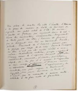 À la suite du manuscrit, on a relié les épreuves corrigées (5 pages in-8 montées à fenêtre au format du manuscrit) composées pour L'Arche, avec des corrections autographes.
