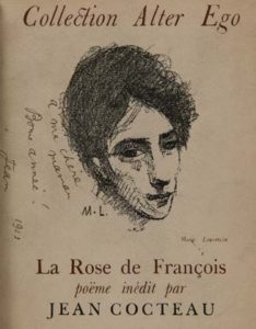 Envoi autographe signé de Jean Cocteau à sa mère, sur la couverture, à côté de son portrait de Marie Laurencin : «à ma chère maman Bonne année ! Jean 1923».