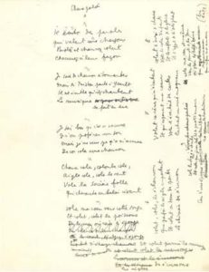 Chanson parlée (1 page in-4, Pl. 1355), manuscrit de travail de cette chanson avec ratures et corrections, en 9 quatrains numérotés (8 dans la version publiée, le 9e inédit). «Il y a des paroles / Qui valent des chansons / Parole et chanson volent /