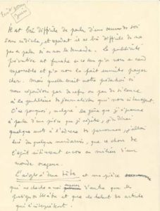 Avant L'Aigle à deux têtes. Présentation du film. [L'Aigle à deux têtes, tourné en 1947 et sorti en septembre 1948, est l'adaptation cinématographique de la pièce créée à Bruxelles en octobre 1946 et à Paris le 22 décembre 1946 par Edwige Feuillère et Jean Marais.] En tête du manuscrit, Cocteau a noté : «(s'il m'est nécessaire de prendre la parole)». Cocteau déclare avoir voulu dans son film «étouffer l'intellect sous l'agir et faire que mes personnages agissent plus leurs pensées qu'ils ne les parlent. J'ai poussé cette méthode jusqu'à leur inventer une psychologie presque héraldique, c'est-àdire aussi loin de la psychologie habituelle que, sur les blasons, les animaux qu'on y représente ressemblent peu aux animaux tels qu'ils existent. Par exemple un lion qui sourit, une licorne qui s'agenouille en face d'une vierge, un aigle qui porte une banderole dans son bec. Ce qui ne veut pas dire que cette psychologie soit fausse, mais qu'elle s'exprime plus réellement, plus violemment que de coutume»... Après le «mécanisme des âmes», il en vient à son travail avec