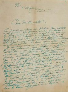 Mme de BRIMONT pour son portrait, et de ne pas fixer de prix : «la commande a toujours été pour moi un empoisonnement et l'obligation de réussir un portrait, [...] une sorte d'entrave à ma liberté». Il préfère faire les deux portraits d'abord pour lui, et s'il les réussit selon lui, les leur céder ensuite «au prix de guerre»... - Très malade, il la prévient du retard et qu'il a pris pour «le petit portrait commencé d'après vous» qu'il est en train terminer. Il s'excuse de lui avoir présenté un marchand «d'estampes et d'objets, truqués pour la plupart», escroc dont il se félicite de la disparition...