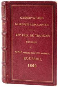 in-12 reliés en un, reliure de l'époque plein chagrin rouge, plats encadrés d'un filet à froid et d'un filet doré ; inscription en lettres dorées sur le plat sup. : Conserva toire de musique & déclamation. 2ème prix de trag édie décerné à Melle Marie Suzanne Roselia