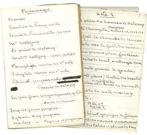 En tête du premier cahier, Sand a dressé la liste des personnages, ainsi que le découpage de la pièce : «1er acte. 1789. Au moutier de Valcreux. Une bibliothèque. 2d acte. 1790.