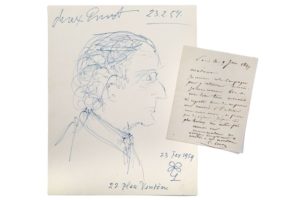 Louise de VILMORIN portrait de Max ERNST de profil au stylo bille daté 23/02/59 situé 22 Place Vendôme et monogrammé 26,7x21. (1 pièce).