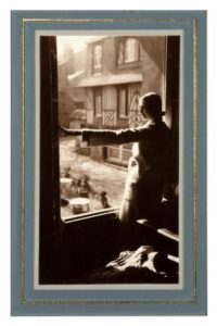 14,5 x 8 cm, sous encadrement. Tirage argentique d'époque représentant Renée PERLE devant une fenêtre à Villerville, en Normandie. Annoté au verso de la main de LARTIGUE et portant sa mention « B 31 ».