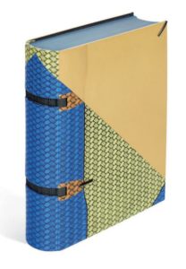 In-8 [192 x 131] de 416 pp. : reliure dite “en biais” composée de box beige sur la partie supérieure des plats et de cuirs “faux tressés” jaune, bleu et havane sur la partie inférieure des plats et sur le dos, pièce d'ébène à l'angle supérieur des plats et au niveau du nerf inférieur, dos lisse à 2 faux nerfs à coutures apparentes, doublures de nubuck bleu foncé, tête bleue, non rogné, plats et dos du cartonnage d'origine conservés, étui-boîte à dos de box noir (Jean de Gonet, 2007).