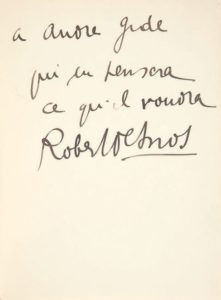 Surprenant envoi autographe signé sur le premier feuillet blanc : a André Gide // qui en pensera // ce qu'il voudra // Robert Desnos