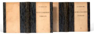 2 volumes in-8 [202 x 150] de (4) ff., 382 pp., (1) f. ; (4) ff., le premier blanc, 360 pp., (2) ff., le dernier blanc : demi-veau crème, bordures verticales et dos teintés en noir, veinés en bleu, gris et or avec lignes lamées d'argent et liserés lamés d'argent, auteurs et titre en capitales au stylet, repassés en gris sur le premier plat, dos lisse, quintuple filets dorés en encadrement à l'intérieur, gardes peintes, tranches dorées sur témoins, couverture et dos conservés, sous étui-boîte en demichagrin bleu moderne (L.-D. Germain).