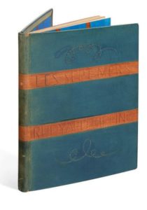 “On retrouve sur les gardes de cette reliure au dessin en continu très simplifié des motifs analogues à ceux du Cocteau [cf. ci-dessus nº 1384] mais traversés de bandes verticales orange, en écho au décor des plats” (Fabienne Le Bars).