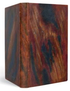 Grand in-8 [279 x 188] de (2) ff., 58 ff. mal foliotés 56, (2) ff. : veau brun nuancé rouge, orange et bleu, partiellement martelé, plats ornés de jeux de lignes obliques lamées d'or et d'argent, évoquant des griffures, titre de l'ouvrage au stylet lamé d'argent sur le premier plat, dos lisse orné de lignes obliques lamées d'argent, quintuple filet doré en encadrement à l'intérieur, doublures et gardes peintes, tranches dorées sur témoins, couverture et dos conservés, étui, étui-boîte de toile bleue moderne (Louise-Denise Germain).
