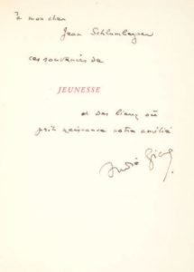 Envoi autographe signé sur le faux-titre : à mon cher // Jean Schlumberger // ces souvenirs de // JEUNESSE // et des lieux où // prit naissance notre amitié. // André Gide
