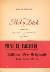 Édition pré-originale de la traduction par Jean Giono, Lucien Jacques et Joan Smith du célèbre roman de Herman Melville : elle est illustrée d'un bois gravé par Alexandre Noll en tête du premier chapitre.