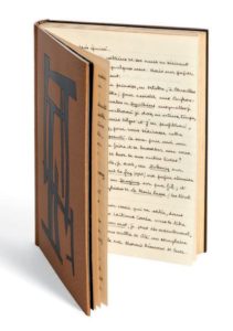 In-8 [204 x 140] de 386 pp., (1) f. : maroquin havane, composition abstraite de box noir sur les plats, dos lisse, doublures bords à bords et gardes de box noir, doubles gardes de papier d'écolier peint à la main à l'encre noire d'imprimerie, tranches dorées sur témoins, couverture et dos conservés, chemise à dos et bandes à recouvrement de maroquin havane, doublée de daim gris, étui (M. de Bellefroid).