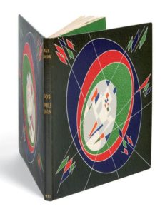 In-8 [205 x 161] de 71 pp., (4) ff. le dernier blanc : maroquin vert foncé, plats ornés d'un décor géométrique dessiné à l'aide de filets blancs, représentants ovales mosaïqués de maroquin bleu foncé, orange, vert clair et de box gris, ainsi que de motifs de losanges, triangles et polygones mosaïqués de maroquin et de box bleu foncé, orange et vert clair ainsi que de box blanc, dos lisse, doublures bords à bords et gardes de maroquin vert clair, tranches dorées sur marbrures, couverture et dos conservés, chemise à dos et bandes à rabats de maroquin vert foncé, étui (Paul