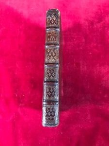 P., Loyson, 1658. In-12, maroquin rouge, titre doré sur dos à nerfs fleurdelisé, double encadrement de filet doré avec monogramme d’angle et aux armes mos. au centre des plats, guirlande intérieure, tranches dorées. Exemplaire réglé aux armes peintes de Dreux d’Aubray, chevalier d’Offémont de Villiers à qui l’ouvrage est dédié. ( ?) De la bibliothèque de Henry Houssaye et Henri Lavedan avec leur ex- libris. Trace de mouillure. Restauration à la coiffe supérieure.