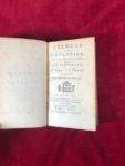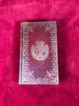 In-12 mar. rouge, pièce de titre, dentelle d’encadrement dorée sur les plats avec au centre armes frappées en or, doublé et gardes de papier fantaisie doré, tranches dorées. Reliure aux armes de la comtesse de Provence, femme du futur Louis XVIII.