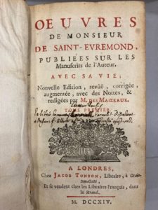 Environ 15 volumes dont SAINT-EVREMOND – Œuvres (Londres, 1714. 7/8 volumes in-12, plein veau.) ; Lettres de quelques juifs, portugais, allemands et polonais, à M. de Voltaire, avec un petit commentaire, extrait d'un plus grand, à l'usage de ceux qui lisent ses œuvres, suivies des mémoires sur la fertilité de la Judée, par m. L’abbé Guénée. (Lyon, chez Ayné frère, 1822. 2/3 volumes, in-12, demi-basane, dos lisse orné.)