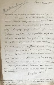 Lettre rédigée de la main de son secrétaire particulier, Hyacinthe Pilorge : «Un rhumatisme à la main droite m'empêche d'écrire [...]».