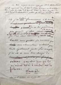 CHATEAUBRIAND, François-René de (1768-1848). Manuscrit avec corrections autographes, à l'encre rouge. S.l.n.d. 1 p. petit in-8. Contrecollé aux quatre angles à un feuillet avec la mention ancienne «Notes autographes de Monsieur le Vicomte de Chateaubriand». Ratures, ajouts et corrections.