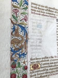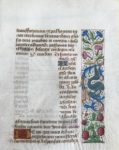 ENLUMINURE. Feuillet enluminé sur vélin, tiré d'un livre d'heures du XVe siècle. Texte en latin. 14, 2 x 11,5 cm. Très bel état, immaculé.