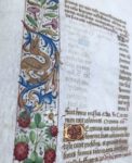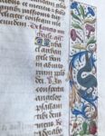 Enluminures recto et verso dans les marges, figurant des pélicans (un doré, l'autre bleu), entourés de feuilles, fraises, fleurs et volutes. Quatre petites lettrines enluminées et texte rubriqué. Deux emplacements ont été laissés vides dans l'attente de lettrines ou de miniatures.