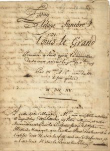 [LOUIS XIV (1638-1715) Roi de France]. Manuscrit, Essay de l'éloge funèbre de Louis le Grand …