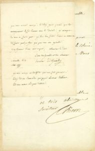 Bel ensemble de documents des Premiers Valets de chambre de Louis XVI. * Claude-Charles Lorimier d'Estroges de CHAMILLY (1732-1794). Versailles 4 mars 1777, à un duc, pour faire part de sa démarche auprès du Roi en sa faveur, au sujet d'une pension… * Marc-Antoine THIERRY DE VILLE D'AVRAY (1732-1792). Garde-meuble [Versailles] 15 septembre 1790, à un comte : « Je viens de donner les ordres pour l'habillement des nés Claude Le Blanc et Louis Guillemin ainsi que vous l'avés désiré »… * Jean-Baptiste Tourteau de SEPTEUIL (1754-1812). [Paris vers juin 1792 ?] : lettre écrite sous la dictée du Roi, pour protester contre une lettre du Maire au Commandant général de la Garde nationale « ou il le prévient d'inquietudes sur mon depart pendant la nuit, fondé, dit-il, sur des probabilités et des indices, il mêle cette nouvelle avec des bruits de mouvemments et d'emeutte et il lui ordonne de multiplier les patrouilles […], lui qui par la Constitution doit faire executer sous mes ordres les loix pour le mainttien de la tranquilité publique », etc. Louis XVI a noté en haut : « pour copie »… * Jean-Baptiste CLÉRY (1759-1809). Prague 21 septembre 1798, au baron de Limon : « Je regrette bien de n'avoir pas avec moi un exemplaire du Journal que je viens de publier sur les dernier moment de notre infortuné Maître et Roi »…Vienne 4 juillet 1808. Quittance donnée à l'évêque de Nancy pour « la somme de 300 f courants de Vienne pour ma pension des trois mois avril mai et juin »… * François HUE (1757-1819). Aux Tuileries 7 mai 1817. Il ne conteste pas les titres de son correspondant pour solliciter les bontés du Roi. « Je crois seulement devoir vous observer que, pendant mon séjour au Temple je ne pouvois me permettre aucune question aux municipaux qui gardoient la famille royale et recevois, en silence, de leurs mains ce qu'ils vouloient bien donner à cette trop infortunée famille »…