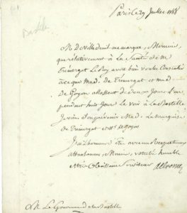 Instructions au sujet des Bretons détenus à la Bastille. - « D'après l'observation [...] que plusieurs de MM les Gentilshommes Bretons détenus à la Bastille ne soupent point, et qu'il seroit plus agréable pour tous de diner ensemble que d'y souper je prendrai sur moi de changer les ordres qui ont été donnés et je vous prie en conséquence de vouloir bien les faire diner ensemble au nombre de trois »... - Le Roi consent, relativement à la santé de M. Trémergat, à ce que Mme de Trémergat et Mme de Goyon aillent le voir à la Bastille. Ancienne collection Alain Taillade (28 mars 1985, n° 61, son cachet encre).
