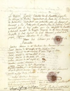 « Le nommé Guerin cavalier de la Prevetoté Generalle des Monnoyes de France, commandant le poste dela Barriere de Fontarabie conduisant une patrouille par les champs, et revenant a son poste par la granderue du faubourg. St Antoine aprenant par la voys public que lon attaquoit la Bastille y condusit aussitot satrouppe composée des cy dessous nommez lesquelles se sont conduit en gens d'honneur y etant resté jusqu'à l'entierre réduction de la place ». Suivent les « Noms des Citoiens qui composoient la Patrouille », avecleur adresse (ils habitent tous rue Charonne) : Guerin, Susset, Tignon, Dodet, Croizé, Aclais, Martin,Jominy, Meunier. À la suite, SAVIN, « ancien commandant en chef du district de Trenelle, Capne des grenadiers de SteMargueritte », atteste : « Il est de notoriété publique dans le quartier que les subnommés ont été au siegede la Bastille » ; signent ensuite VERDIER, « Président de Tresnel dans la premiere semaine de la revolution » ; Jacques BELHOMME, « tresorier du ditrique de St Marguerite » ; LEMASLE et JOUIN, électeurs dudistrict. Le document est certifié et signé par DEMOULIN et LADEVEZE, Président et Secrétaire duDistrict de Sainte-Marguerite (cahet de cire) ; puis par VERPY et COUCHÉ, Président et Secrétaire greffier duDistrict de Popincourt « ci-devant appellé Tresnel » (cachet de cire : District de Popincourt, Libre et Juste).Rare document portant la rare signature de Jacques BELHOMME(1737-1824), dont la « maison de santé », rue de Charonne, accueillit et abrita bien des prisonniers aristocrates sous la Terreur.