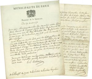 Bon-Claude CAHIER de Gerville (1751-1816) Procureur-Syndic de la Commune de Paris, ministre de l'Intérieur. 2 L.A.S. comme Procureur-Syndic de la Commune, Paris1790-1791 ; 2 et 1 pages in-4, à l'en-tête et vignette de la Municipalité de Paris.