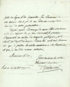 Il lui envoie un exemplaire imprimé de la protestation contre le Décret du 19, qu'ils ont signé pour lui devinant ses intentions, « sûrs que le danger vous rendoit […] les Loix de l'honneur encore plus chères, s'il étoit possible. Nous avons adressé au Président cette protestation, il nous l'a renvoyée. Nous avons fait imprimer sa réponse et notre lettre à la suite de la protestation elle mesme », qu'il compte bien déposer, s'il trouve un notaire assez courageux. « Cette assemblée nationale effraye tout le monde. C'est la fable du lapin et des grenouilles »… Il termine en assurant le duc de son fidèle attachement et de son respect : « De ces deux sentiments, le premier s'augmente au milieu des tempêtes publiques, et le second, en dépit des décrets. L'assemblée nationale trouvera bon que je préfère les vieilles maximes à ses fantaisies »…