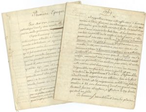 Théophile MANDAR (1759-1823) ardent meneur des journées révolutionnaires, commissaire du Conseil exécutif, littérateur. MANUSCRIT avec corrections autographes, Première époque et 1791. 2e époque ; 2 cahiers cousus de 14 et 23 pages in-4.